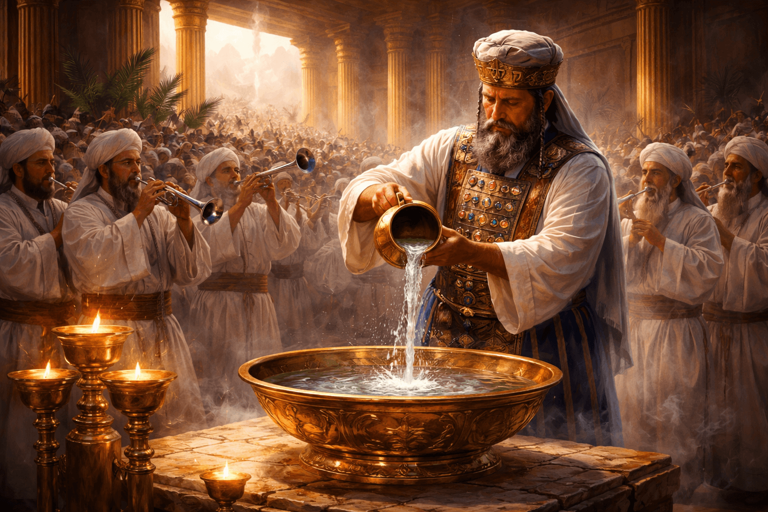 By the time of Jesus, an additional ritual had become part of the celebration—a water-pouring ceremony known as Simchat Beit Hashoavah, the Festival of Water Drawing. Priests would draw water from the Pool of Siloam, carry it to the temple with the sound of the shofar, and pour it out at the altar along with wine. This ceremony marked the beginning of earnest prayers for rain and was filled with great rejoicing.