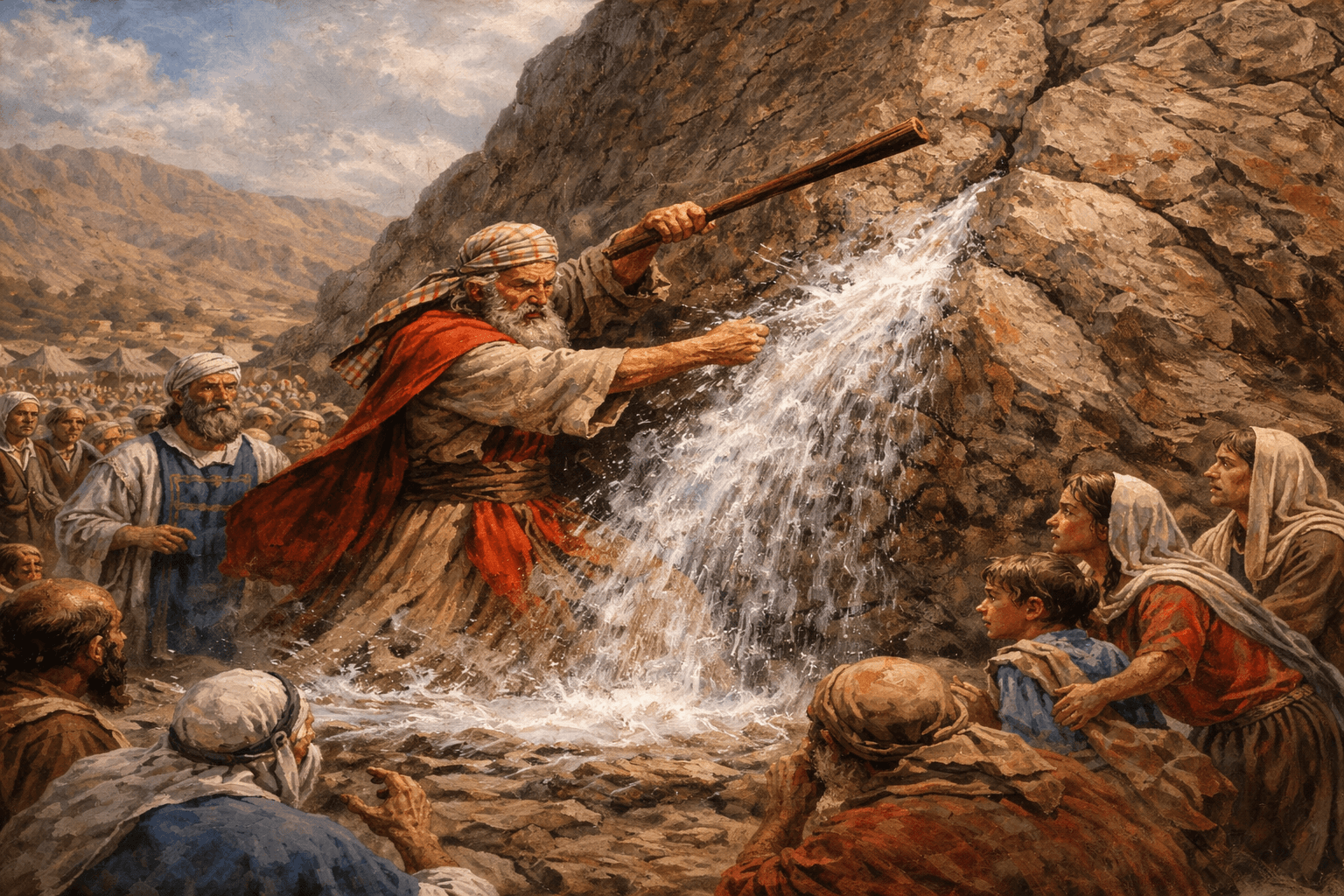 The first time happened at Rephidim early in Israel’s journey after leaving Egypt. The people complained to Moses because there was no water. God instructed Moses to go to a rock at Horeb with the elders of Israel and strike the rock with his staff. When Moses did this, water flowed out for the people to drink. The place was called Massah and Meribah because the Israelites quarreled and tested whether God was truly among them (Exodus 17:1–7).